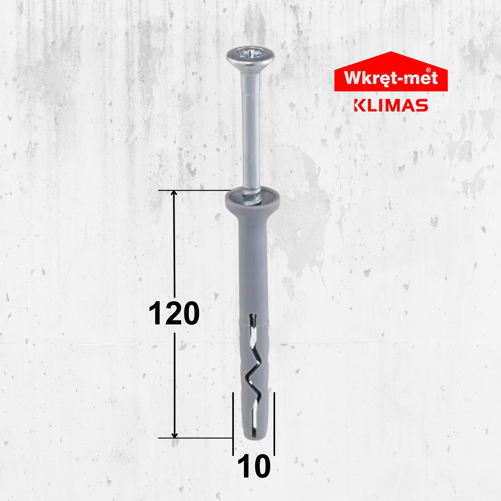 Diblu de percuție 10x120 mm pentru fixări rapide în beton sau zidărie. Set 50 bucăți cu șurub zincat inclus.