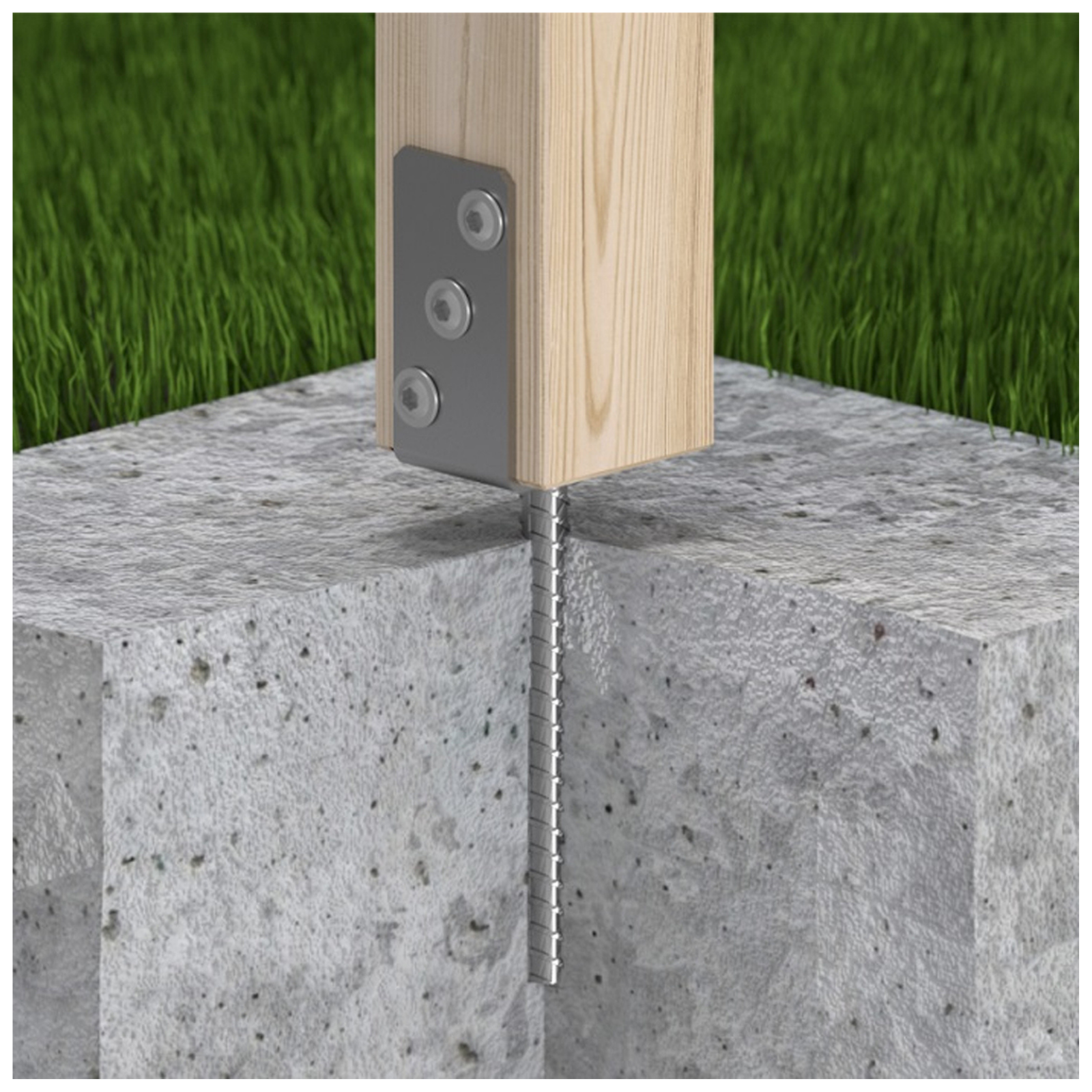 Instalarea se face prin inglobarea piciorului metalic (16 x 200 mm) in beton proaspat sau prin fixare cu ancora chimica intr-o gaura pre-existenta. Ulterior, stalpul de lemn se introduce in cupa si se fixeaza cu holzsuruburi sau buloane prin orificiile laterale